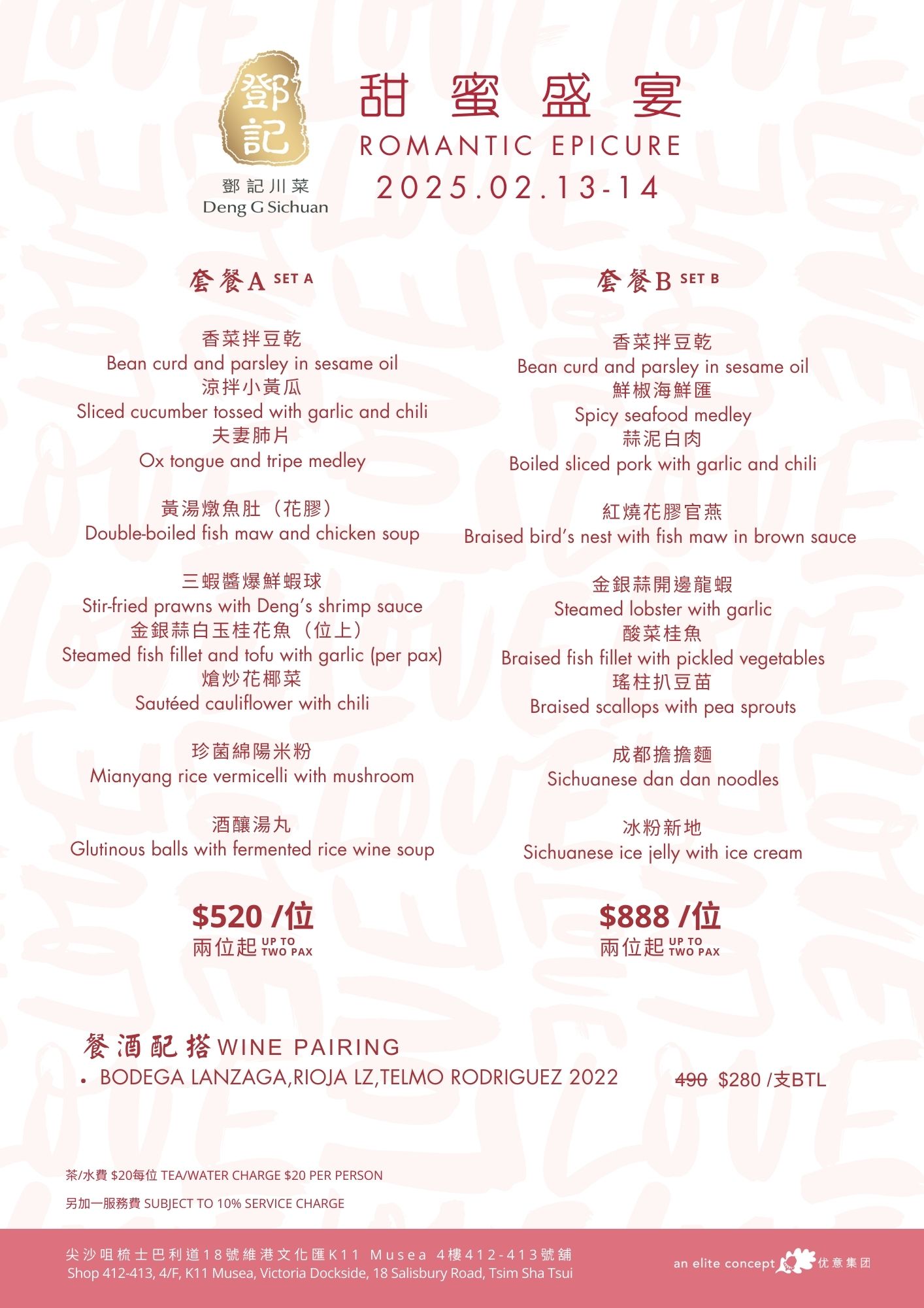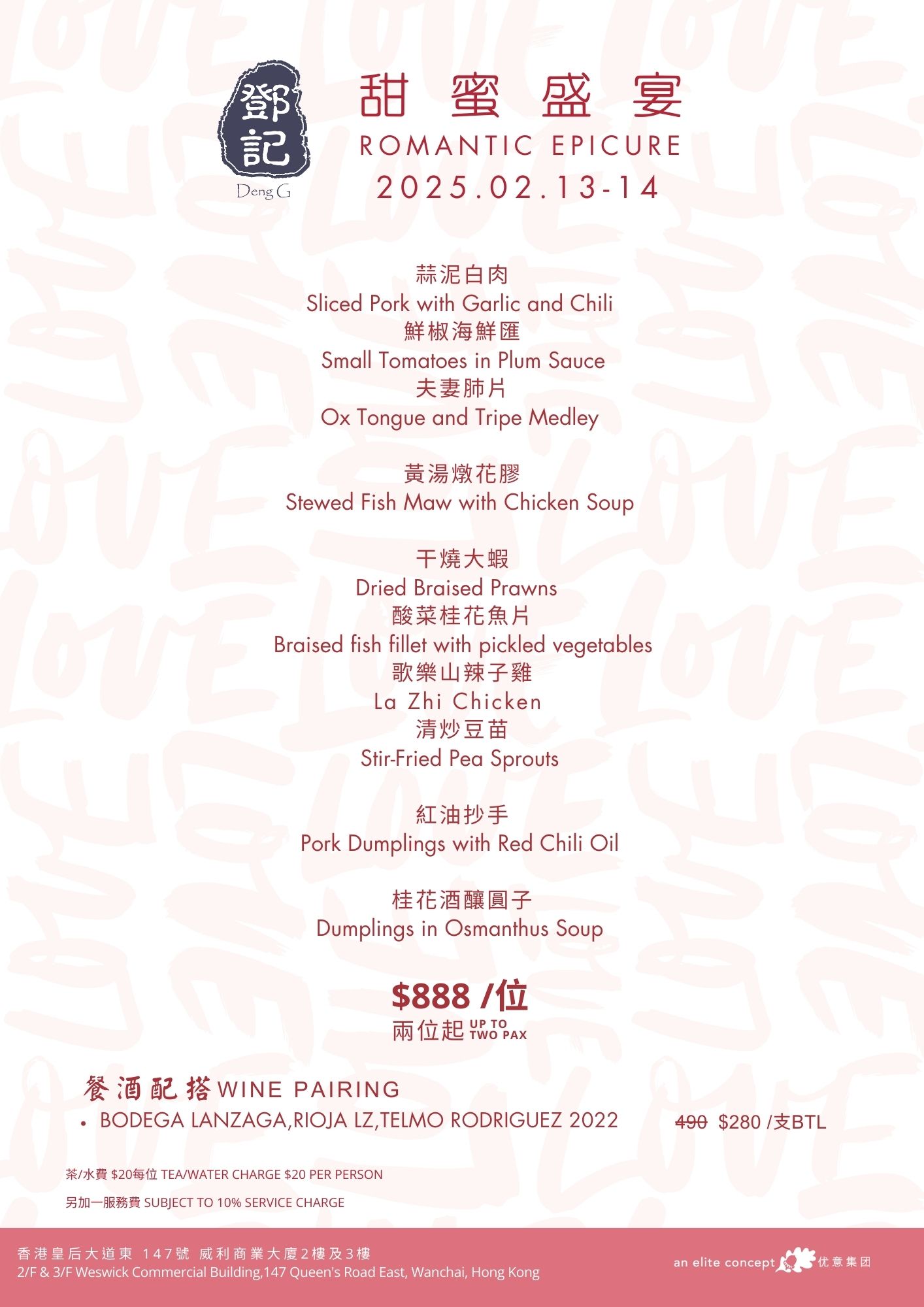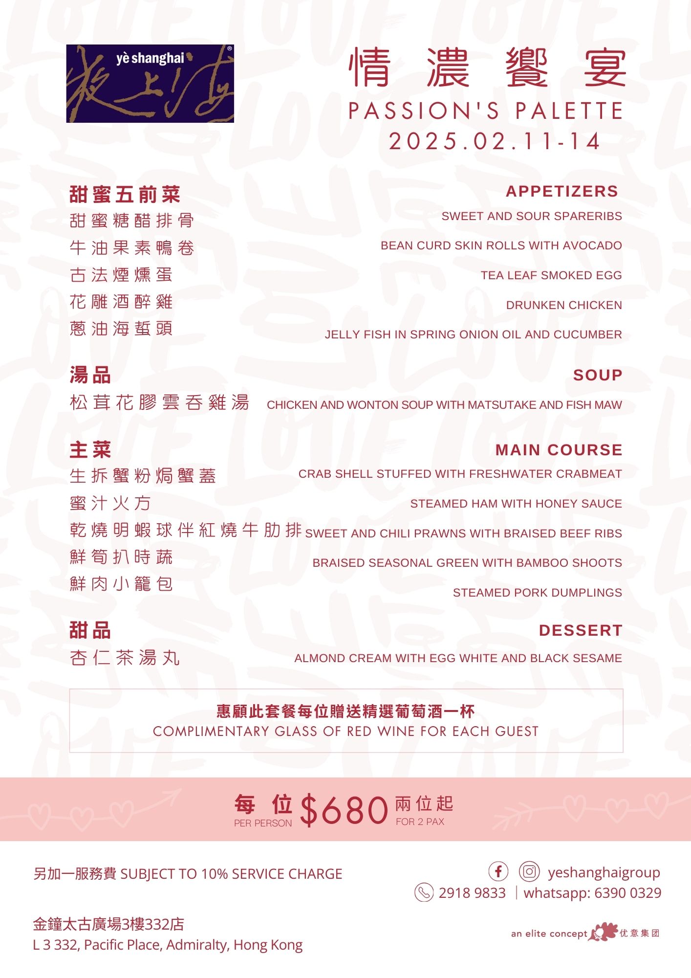 Celebrate Romance on Valentine's Day Valentine's Day is just around the corner! Why not prepare a romantic dinner for your beloved to express your love? The restaurants under the Elite Concepts Group have meticulously crafted various Valentine's Day packages to cater to different tastes and preferences! Let you and your loved one fully enjoy this special day's romantic atmosphere and delicious dishes! Reserve your table now for an unforgettable Valentine's celebration! Menu: 南海1號 Nanhai no.1 南海2號 Nanhai no.2 鄧記 灣仔 Deng G  Wanchai 鄧記川菜 Deng G  Sichuan 夜上海 尖沙咀 Yè shanghai – Kowloon 夜上海 金鐘 Yè shanghai – Admiralty