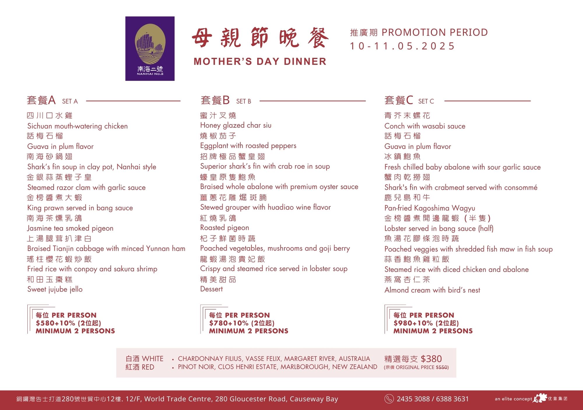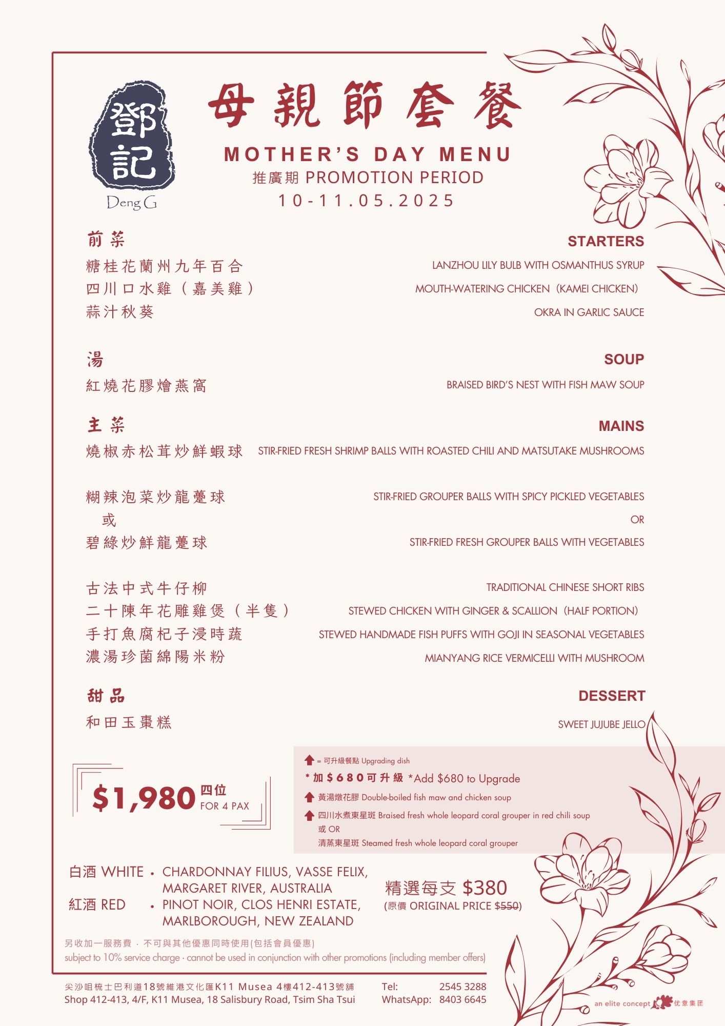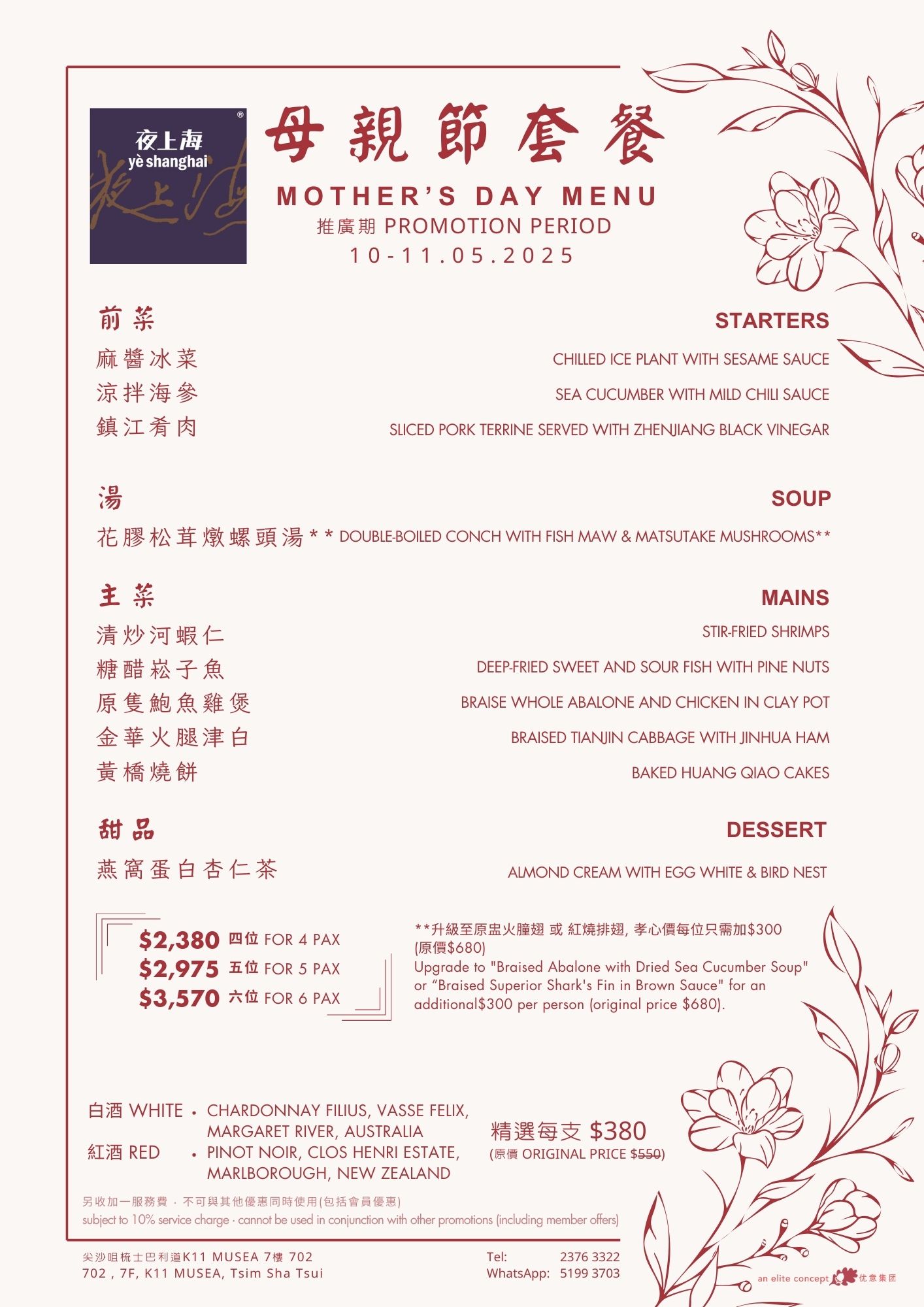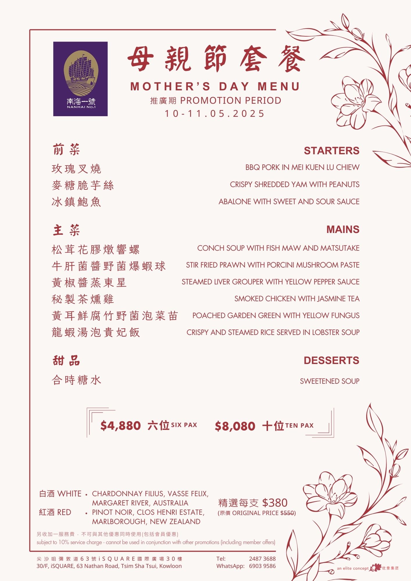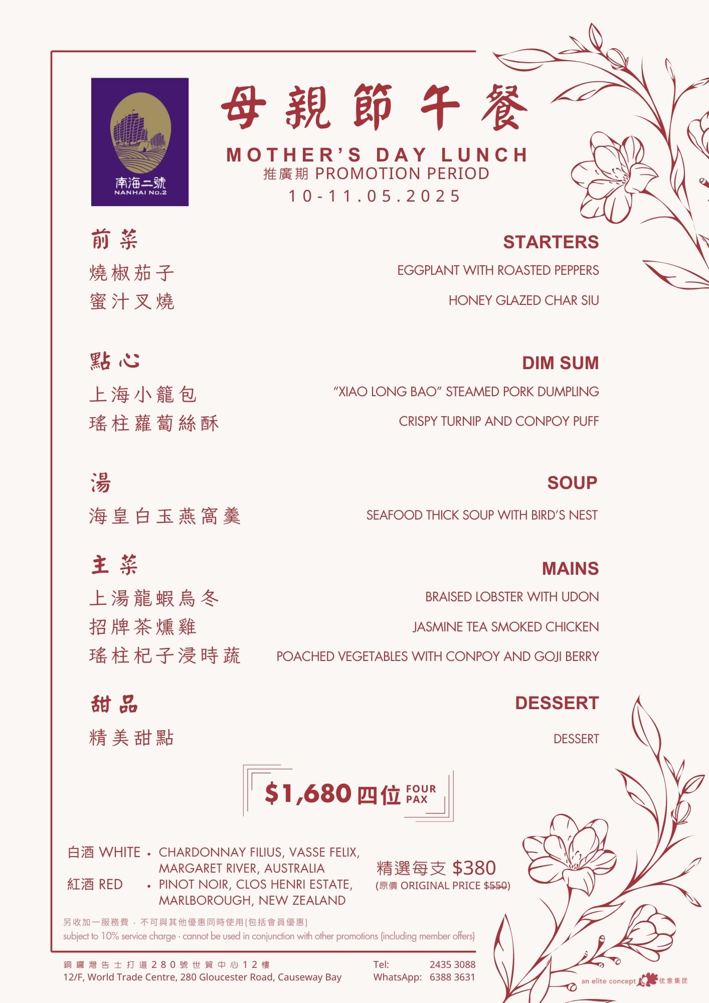 Mother’s Day is the most meaningful celebration in May! To show appreciation for all the amazing moms, Elite Concepts has prepared a selection of nourishing and delicious dishes for you to create warm and unforgettable moments with your mom. During Mother’s Day, Nanhai No. 1 & No. 2, Ye Shanghai (Tsim Sha Tsui & Admiralty), and Deng G (Tsim Sha Tsui) are launching special Mother’s Day set menus. Give your mom a heartfelt surprise with these delightful culinary experiences; she deserves to feel extra special. Menu: Nanhai no.1 Nanhai no.2 Lunch | Dinner Deng G Tsim Sha Tsui Yè shanghai – Kowloon Yè shanghai – Admiralty
