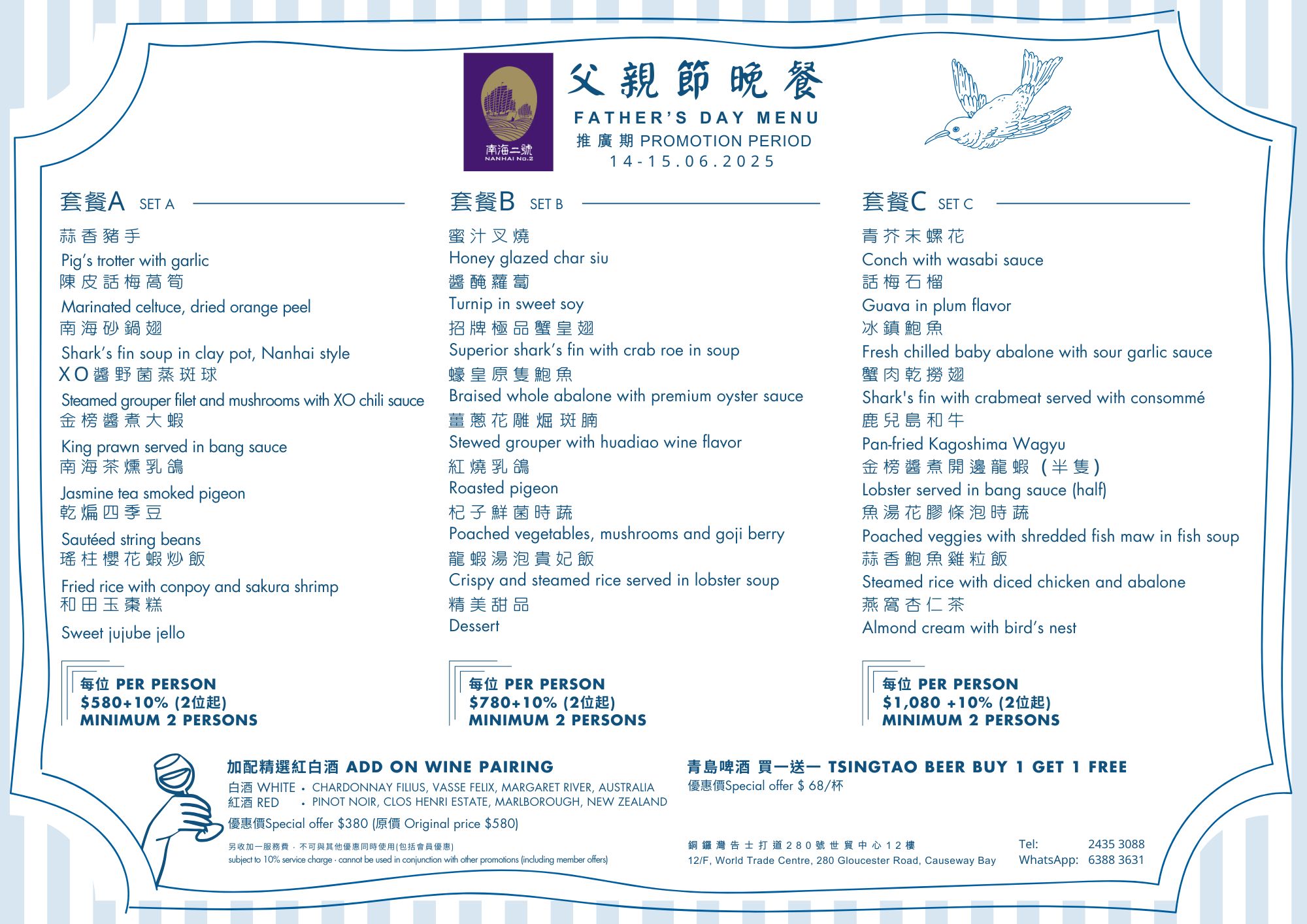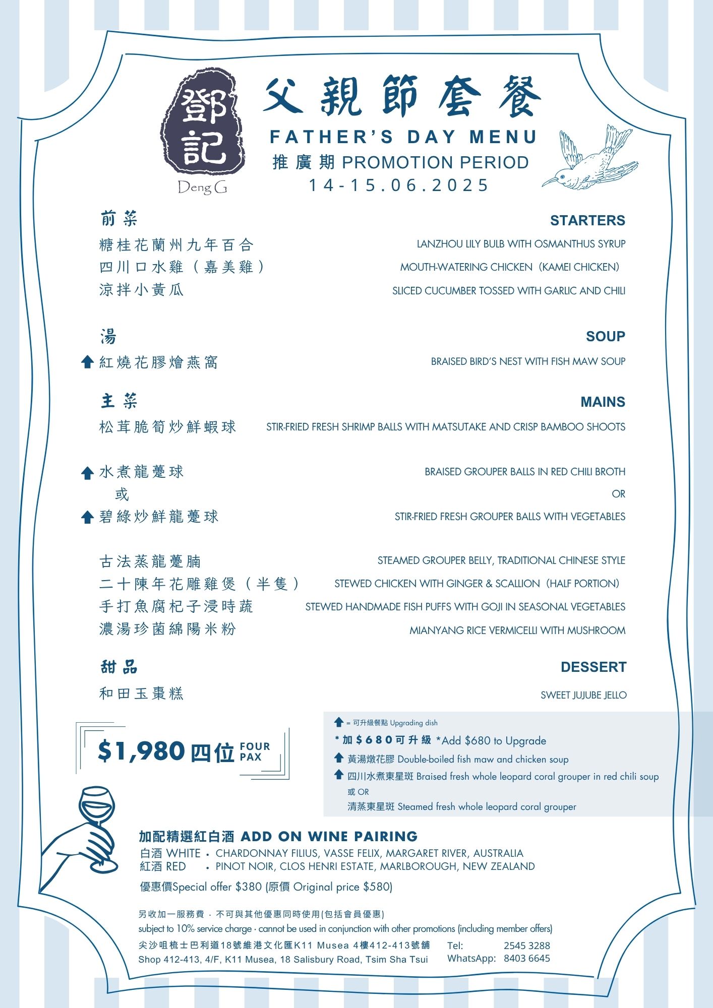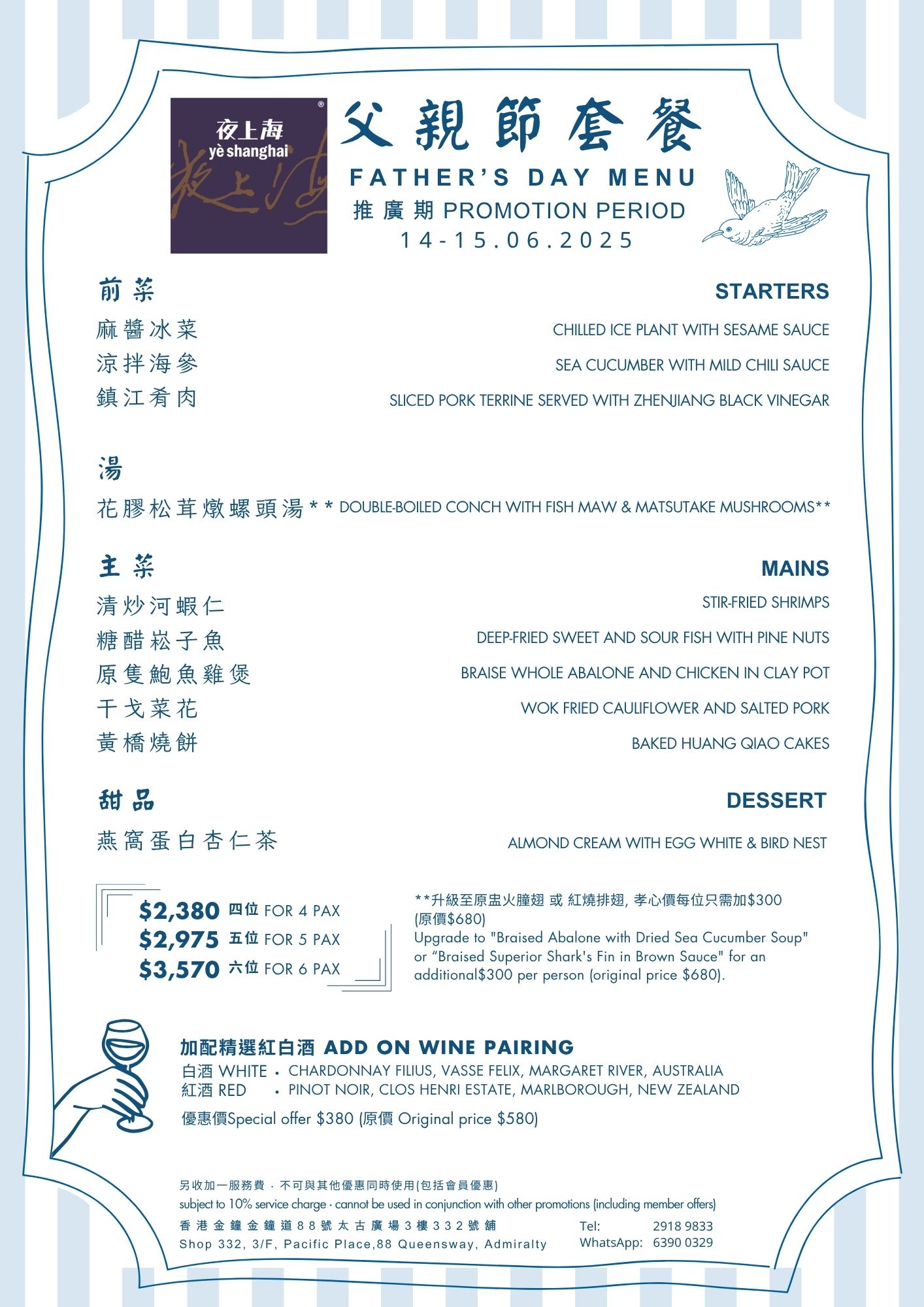 How much does your dad mean to you? Show your love by treating him at one of our restaurants, where private rooms are also available. With Father’s Day menus available at Nanhai No.1 or 2, Deng G Sichuan or yè shanghai (Hong Kong & Kowloon), or a very special and elegant set menu at PENTHOUSE, for modern Chinese cuisine in an intimate private club atmosphere. Go on, make his day and say “Thanks Dad, for everything.” Menu: Nanhai no.1 Nanhai no.2 Lunch | Dinner Deng G Tsim Sha Tsui Yè shanghai – Kowloon Yè shanghai – Admiralty