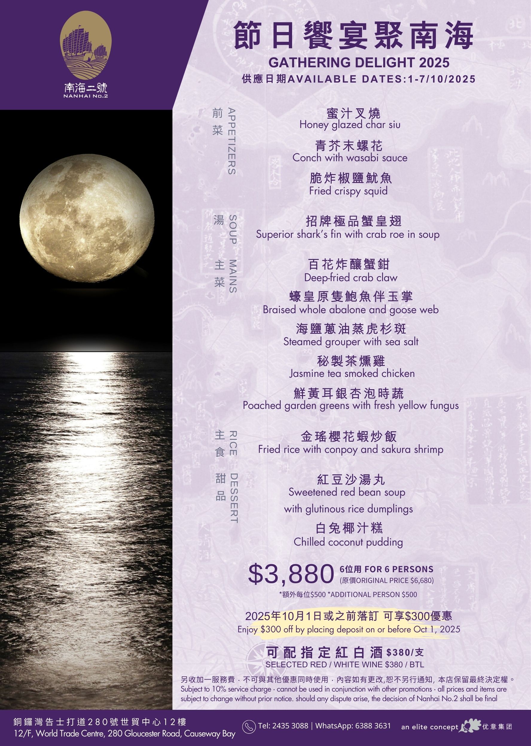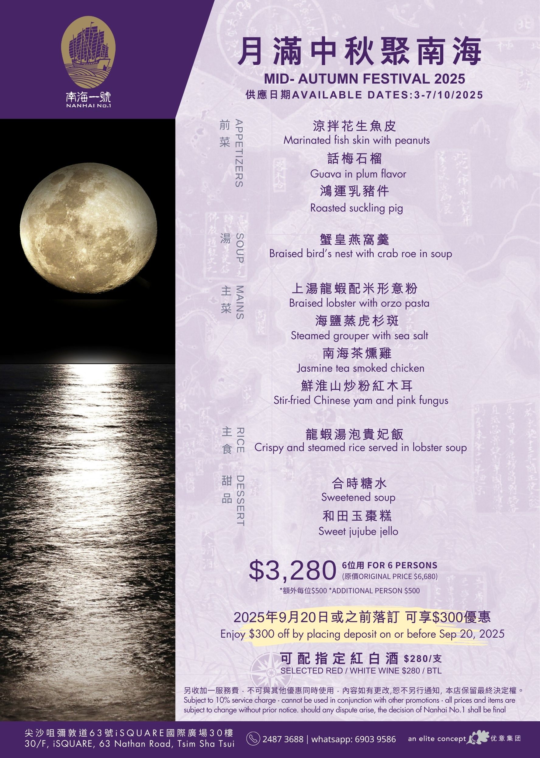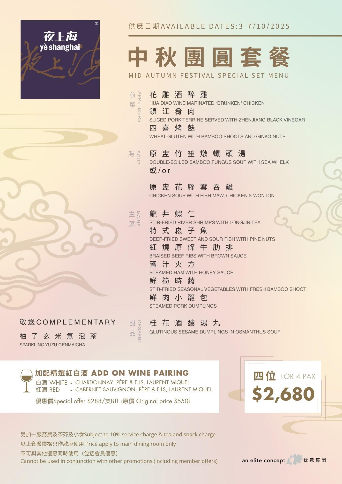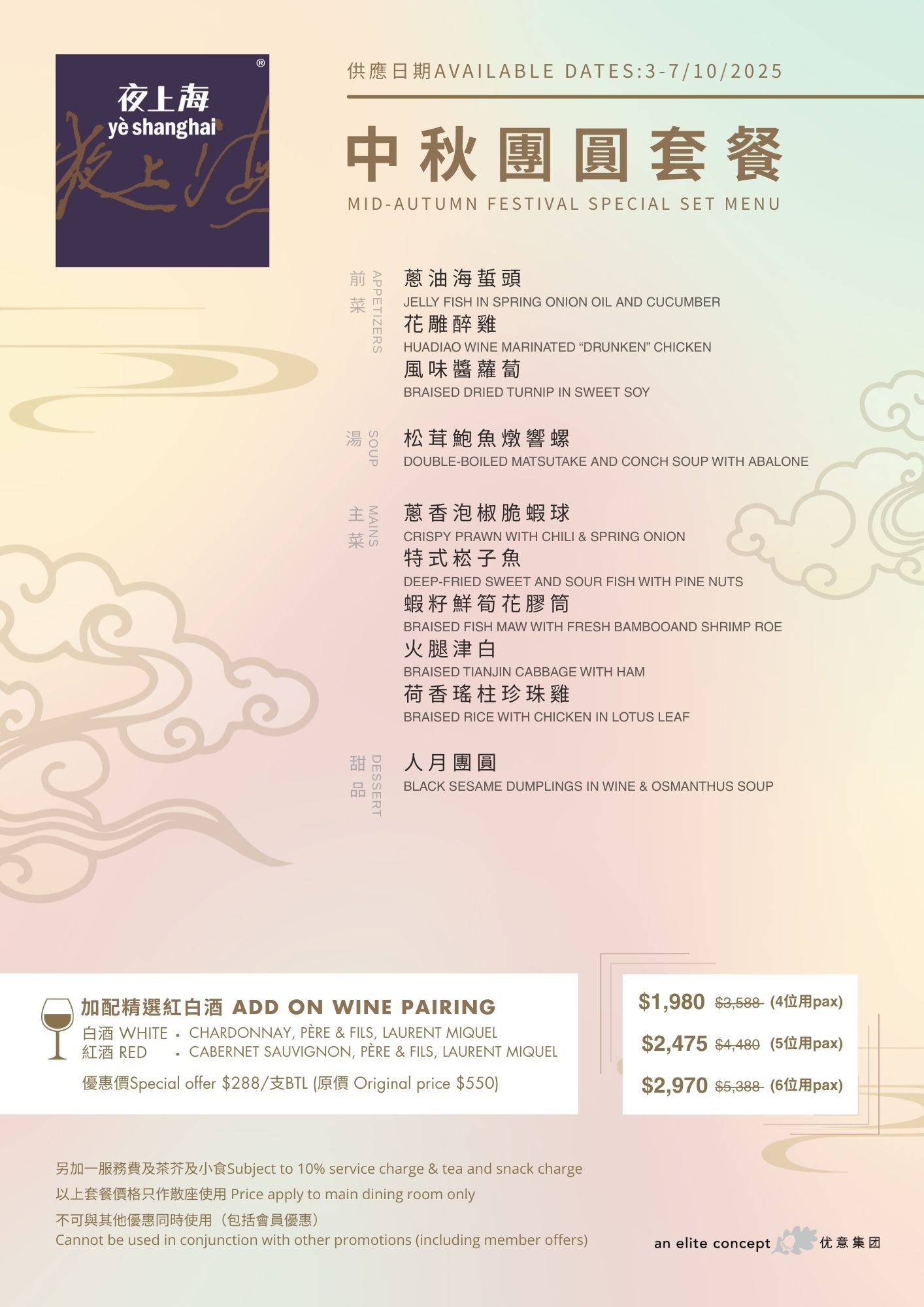 Elite Concepts has curated a variety of Mid-Autumn set menus for you to celebrate this festive season with your family. These menus feature a range of cuisines, including Shanghainese, Sichuanese, and Cantonese. To accommodate your party size, private dining rooms with various capacities are available for your selection. Whether for three generations or small families, this venue is perfect for your consideration. Available Date & Menus: Yè shanghai – Admiralty : 4th – 7th October, 2025 Menu Yè shanghai – Kowloon : 4th – 7th October, 2025 Menu Nanhai no.1 : 4th – 7th October, 2025 Menu Nanhai no.2 : 1st – 7th October, 2025 Menu Deng G : 4th – 7th October, 2025 Menu Lotus & Spice : 3rd – 7th October, 2025 Menu