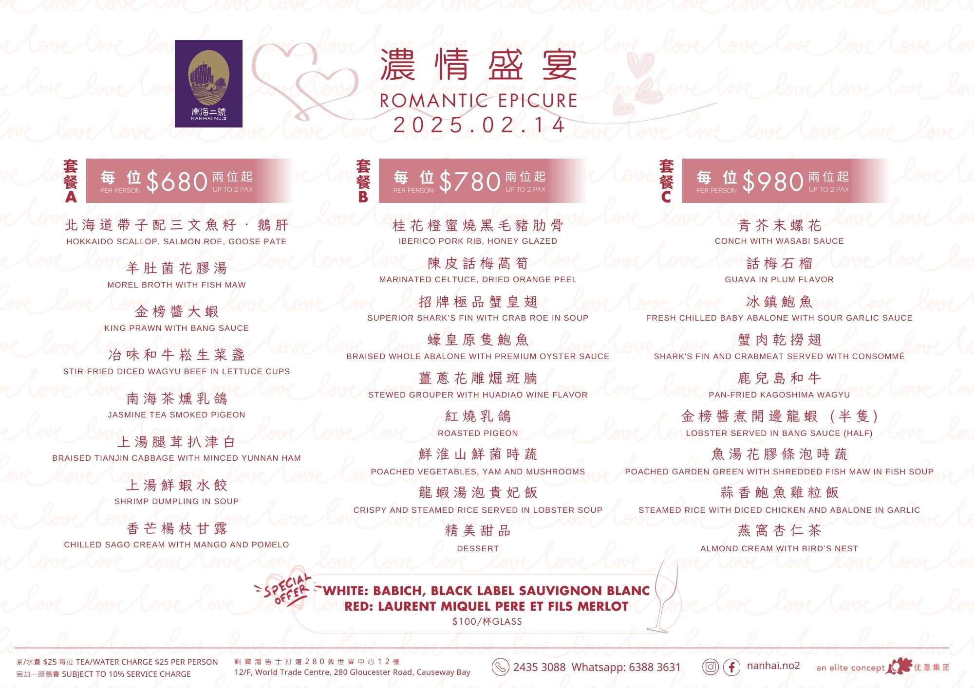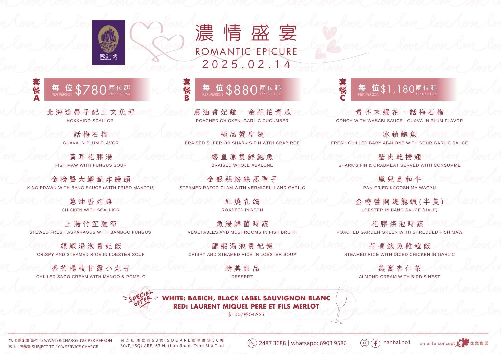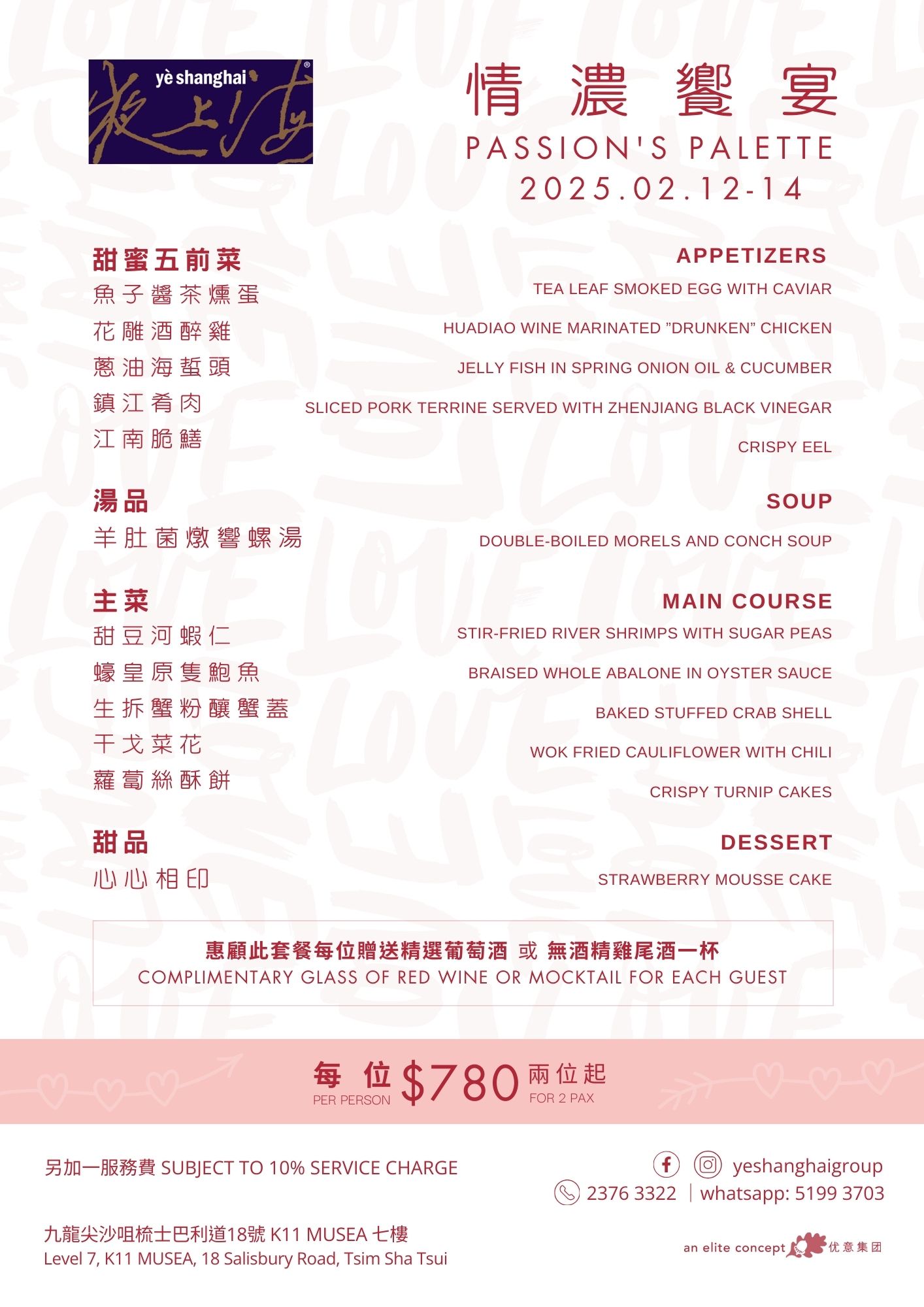 Celebrate Romance on Valentine's Day Valentine's Day is just around the corner! Why not prepare a romantic dinner for your beloved to express your love? The restaurants under the Elite Concepts Group have meticulously crafted various Valentine's Day packages to cater to different tastes and preferences! Let you and your loved one fully enjoy this special day's romantic atmosphere and delicious dishes! Reserve your table now for an unforgettable Valentine's celebration! Menu: 南海1號 Nanhai no.1 南海2號 Nanhai no.2 鄧記 Deng G 夜上海 尖沙咀 Yè shanghai